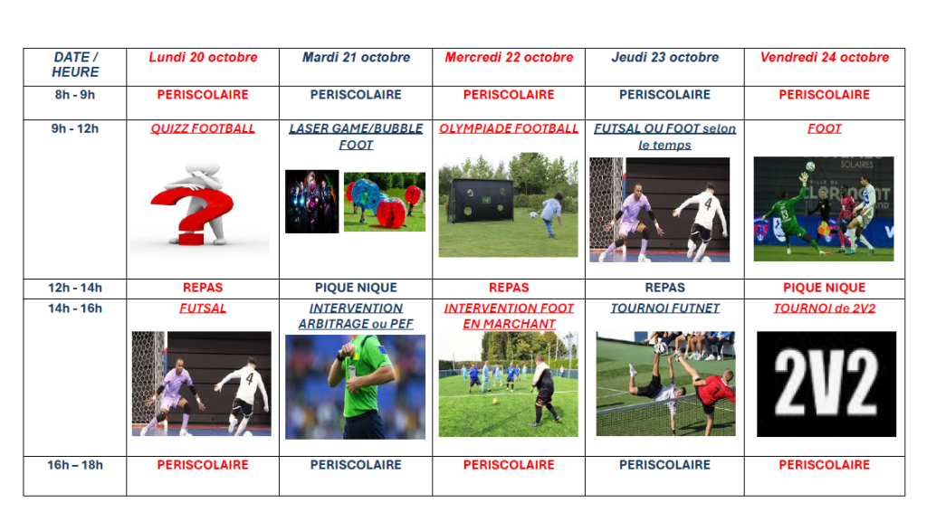 Au programme, football, futsal, laser game, bubble foot, futnet, les olympiades, initiation à l'arbitrage, sensibilisation à la protection de l'environnement, aux valeurs citoyennes sont aussi au programme parmi tant d'autres thèmes éducatifs qui seront abordés de manière ludique avec nos éducateurs !